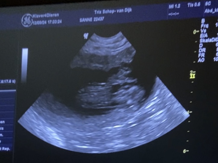 12-9-2024 Op deze dag zijn wij uiterst nerveus naar de Dierenarts gereden. Hoewel je gevoel zegt dat het wel goed zit, wil je het toch zeker weten. In eerste instantie leek Trix niet heel erg gegroeid, maar toch bleek ze al bijna 5 kilo te zijn aangekomen. Voorzichtig is onze dierenarts met de scan over haar buik gegaan. Helaas vraagt het precisie werk en kon er niet met 100% zekerheid gezegd worden hoeveel pups Trix draagt. Maar dat ze dracht is = 100%